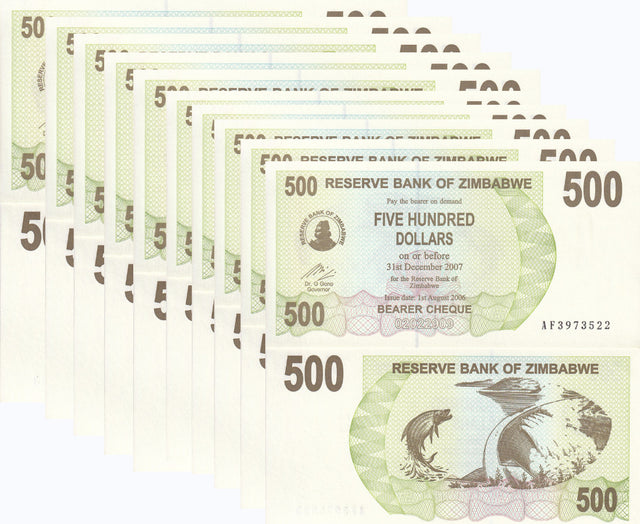 Zimbabwe 500 Dollars Bearer Cheque 2006 P 43 UNC Lot 10 Pcs