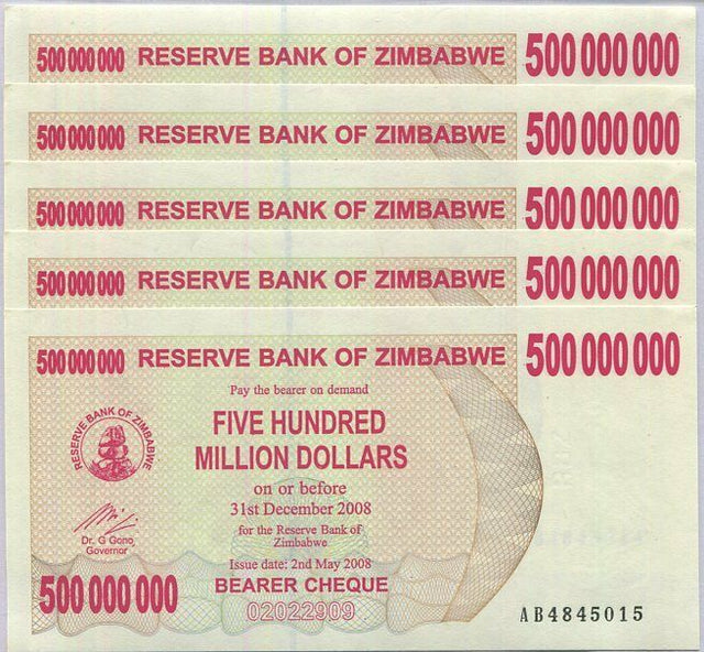 Zimbabwe 500 Million Dollars 2008 P 60 UNC LOT 5 PCS