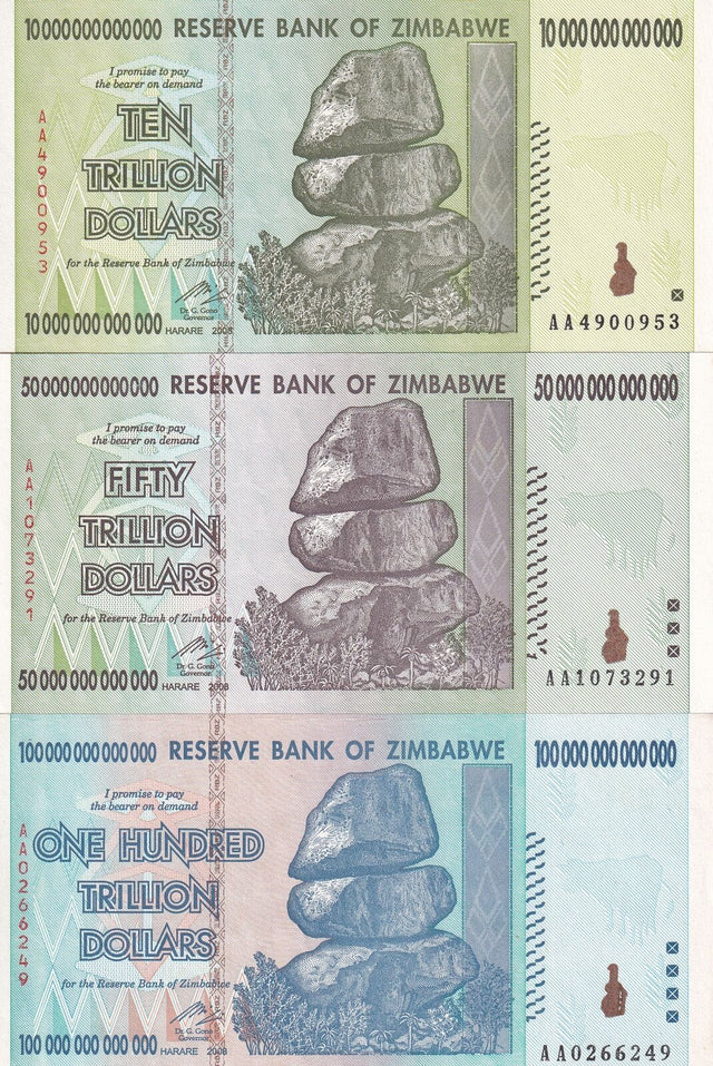 Zimbabwe SET 3 AUnc 10 50 100 Trillion Dollars 2008 P 88 90 P 91