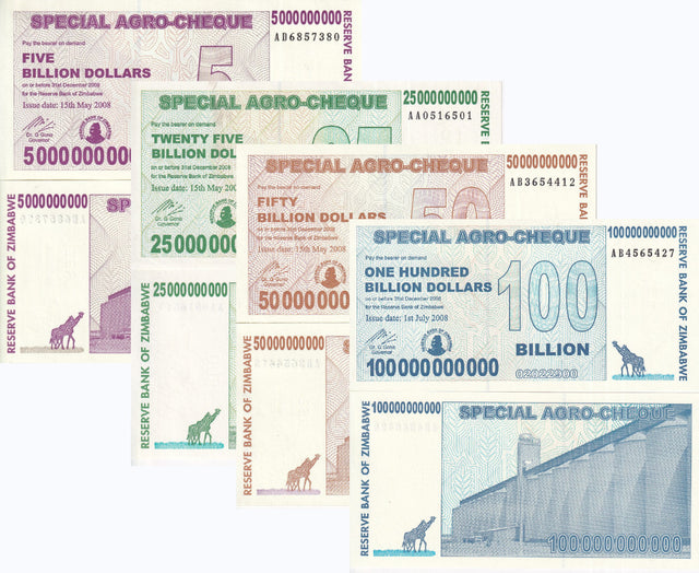 Zimbabwe set 4 UNC 5 25 50 100 Billion Dollars 2008 Agro-Cheque P 61 62 63 64