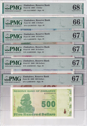 Zimbabwe Set 6; 1 5 10-100 500 D. 2009 P 92-P 95 97 98 Superb Gem UNC PMG 67 EPQ